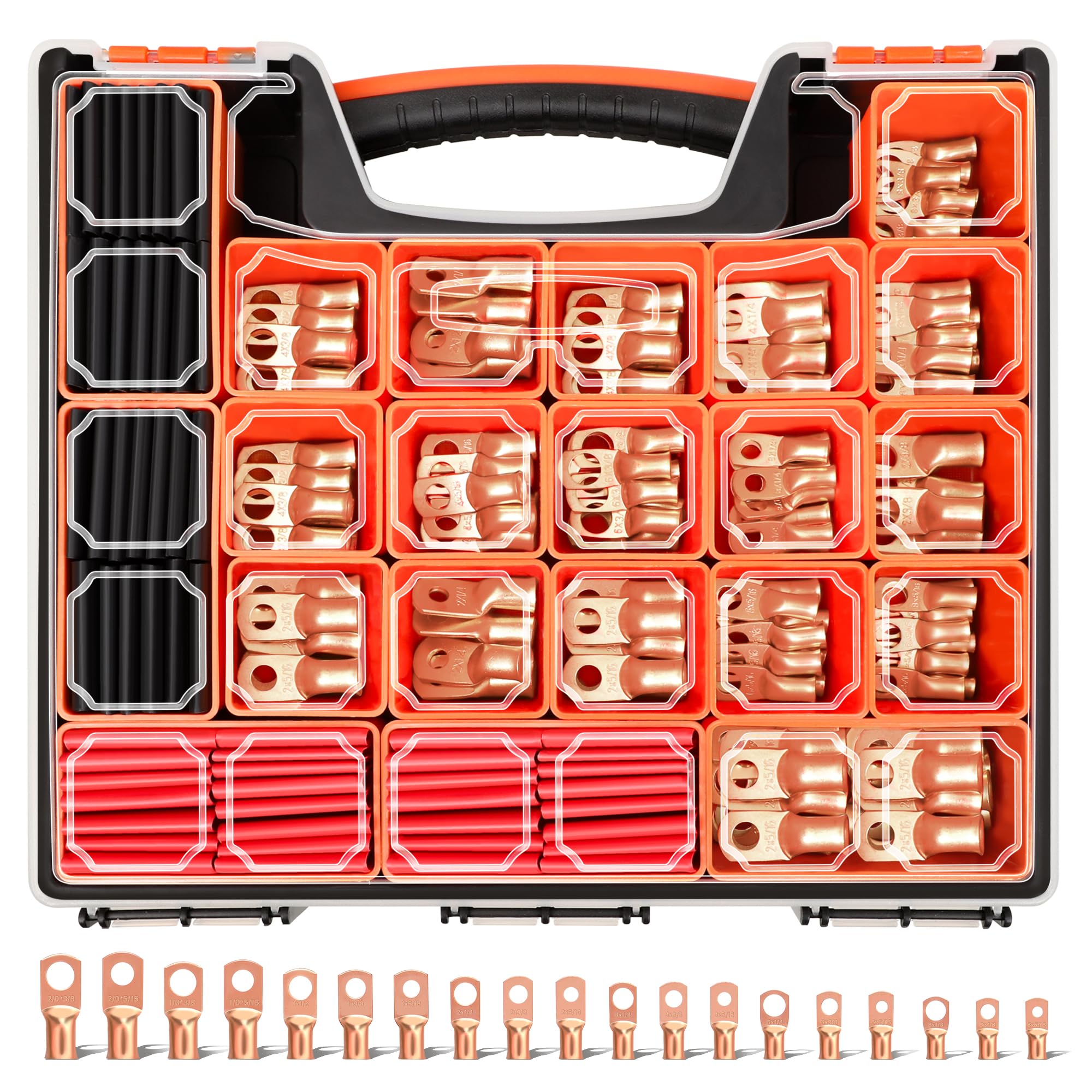 Filluck's heavy-duty copper wire lugs kit offers a versatile selection of UL-certified terminals in multiple AWG sizes (1/0 to 6) and bolt hole diameters, each paired with 3:1 heat shrink tubing for secure, insulated connections. Made from pure copper for high conductivity and corrosion resistance, the terminals feature a flared design for easy crimping and a vibration-resistant ring shape. Housed in a portable, organized toolbox, this professional-grade set is ideal for automotive, marine, solar, and various electrical applications.